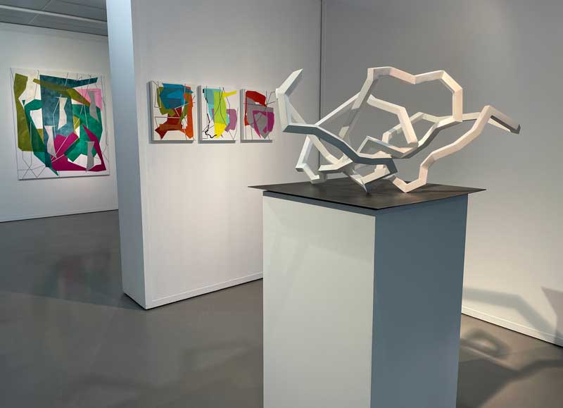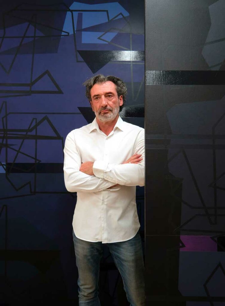 Avant d’entrer dans le vif du sujet, à savoir : la peinture du sculpteur, il convient de revenir brièvement sur son œuvre sculpturale. Depuis près de trois décennies, Nicolas Sanhes est reconnu pour ses grandes sculptures blanches. Ses œuvres monumentales s’inscrivent dans une filiation qui rappelle les figures emblématiques de la sculpture contemporaine, telles que Bernar Venet, Robert Schad, et, plus proche de nous, notre compatriote basque Eduardo Chillida. Pourtant, son approche artistique se distingue nettement de celle de ces maîtres. Là où Venet, Schad et Chillida explorent la ligne comme un élément de structure et de mouvement, Sanhes adopte une démarche unique : il referme la ligne, transformant ainsi cette dernière en une forme qui accueille un vide. Cette spécificité confère à son œuvre une dimension inédite où le vide n’est pas simplement une absence, mais un espace de potentialité. Dans ses sculptures, chaque courbe et chaque angle semblent dialoguer avec le néant, créant une tension palpable entre la matière et l’immatériel. Ce choix délibéré de refermer la ligne permet à Sanhes de jouer avec les perceptions, invitant le spectateur à contempler non seulement la forme, mais aussi ce qu’elle suggère au-delà d’elle-même.