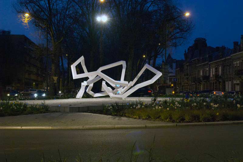 Dans des conditions aussi difficiles et même impossibles, j’admire depuis longtemps le talent et la subtilité de Nicolas Sanhès. Ses « résilles » de cornières métalliques, aux dimensions imposantes mais jamais hors de propos, polarisent les espaces (places, jardins, ronds-points) sans peser. Leur forme ouverte est elle-même matrice d’innombrables sous-formes qui apparaissent au fil des déplacements aussi bien du regard que du corps des passants et spectateurs. Ces sculptures en forme de nids, de vasques, de reliefs géologiques donnent sens à des espaces urbains qui sont devenus aujourd’hui la plupart du temps des espaces poubelles (junk spaces selon l’expression de Rem Koolhaas) ou des non-lieux où l’on passe sans pouvoir se situer et sans savoir où l’on est. Elles ont aussi l’avantage fonctionnel de ne pas couper la vue, de ne pas produire de zones aveugles, ce qui est important aussi bien pour la circulation que pour la sécurité. Elles établissent ce que j’appellerais un « commerce avec l’espace », c’est-à-dire une relation heureuse, sereine et calme, équilibrée et forte, sans s’imposer ni comme choc visuel imposant l’attention, ni comme signe porteur de message ni comme installation se dissolvant de manière gazeuse dans l’espace. La recherche est celle d’un équilibre précis et juste. Nicolas Sanhes le dit mieux que je ne le ferais : « dans la sculpture si j’écarte trop les lignes, la sculpture se creuse. Inversement si je les resserre trop, elle se referme et son énergie s’affaiblit. C’est cette dualité qui est importante à trouver, cette mise en tension qui fait que l’œuvre trouve sa pleine puissance. » Il y a là un traitement de l’espace rare et précieux, qui ramène aux fondamentaux de la sculpture dans un espace neutre. Si j’ai mentionné Bernar Venet, c’est parce que celui-ci a une recherche analogue, plus tournée vers le sublime et les effets grandiloquents, mais toujours avec des formes ouvertes. A l’opposé, il faut bien reconnaître que beaucoup de « sculpteurs » aujourd’hui font l’impasse sur cette problématique et produisent de « l’art de ronds-points », dont l’incongruité contribue encore un peu plus au devenir-poubelle de l’espace public.