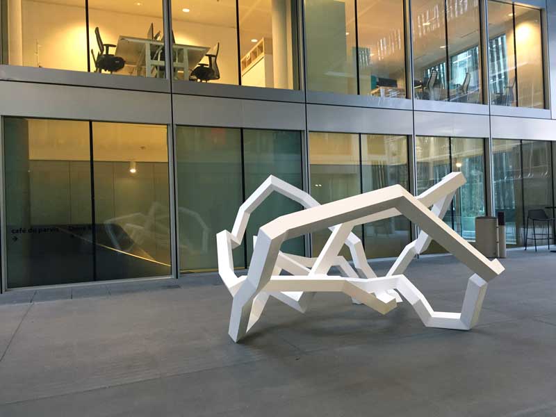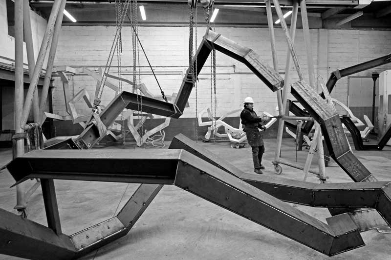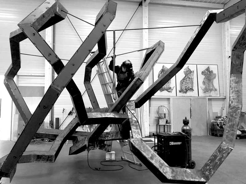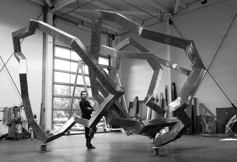 Ses sculptures d’acier, quelles que soient leurs tailles, fonctionnent toujours en circuit fermé. Toujours posées sur trois arêtes, elles évoquent l’image d’un équilibriste, explorant des déséquilibres jusqu’à atteindre une cohésion dans le labyrinthe qu’elles façonnent. Le vide entre ses lignes devient alors un espace de dialogue, une matière immatérielle où la densité de l’air défie l’apesanteur de l’acier.
