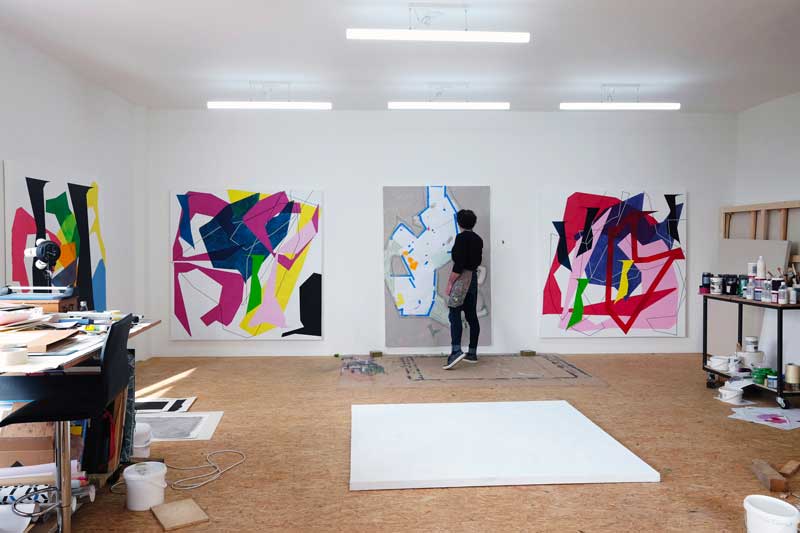 Dans un coin de l’atelier où Nicolas Sanhes réalise ses peintures, on peut remarquer une boule de morceaux de bandes d’adhésif maculés de couleurs, collés les uns sur les autres et qui forment une sorte d’œuf de papier avec des vides et des pleins. Ce sont des restes de masking tapes, ces rubans de masquage qu’utilisent les peintres professionnels pour passer les couleurs sans déborder sur les parties qui ne doivent pas être peintes ou le sont d’une autre couleur – plinthes, rebords de fenêtres, vitres, angles. Les artistes qui veulent délimiter avec précision formes et fonds utilisent aussi ces bandes de masking tapes. Mondrian fut un des premiers à s’en servir avec quelque chose comme du sparadrap ; de même ensuite Newman. Nicolas Sanhes s’en sert pour bien délimiter les découpes des formes géométriques sur ses surfaces.