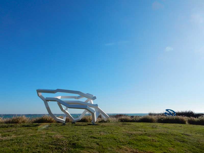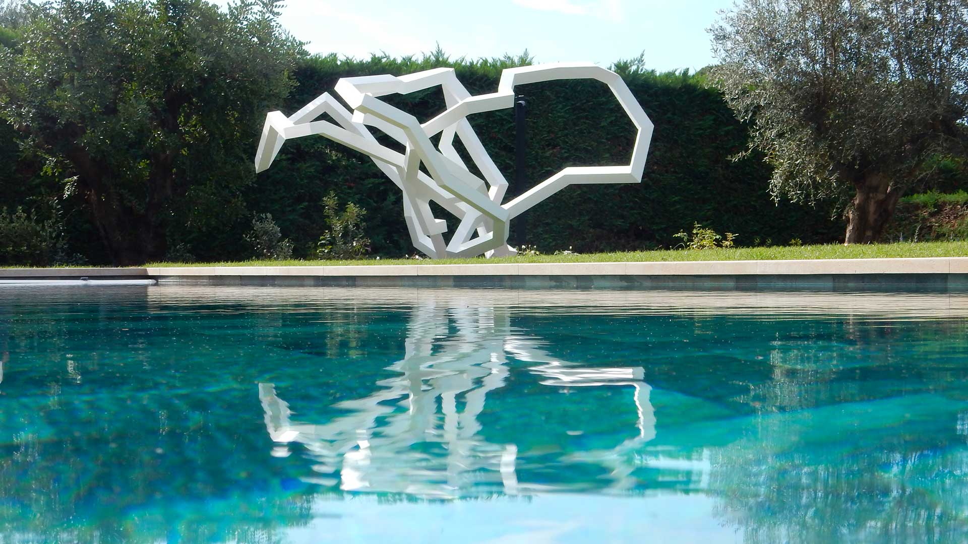 Je connais Nicolas Sanhes depuis bientôt cinq années et peux mesurer la qualité de sa démarche. Très régulièrement, au fil des projets, j’ai vu se développer de grandes sculptures in situ qui sont d’étranges signes blancs posés sur le vert cru des prairies, des lignes contrariées d’angles qui rappellent des sinusoïdales fracturées. Des rubans de Möbius hachés en sections brisées. Le début et la fin se confondent dans ces conceptions de métal soudé. C’est un tout.