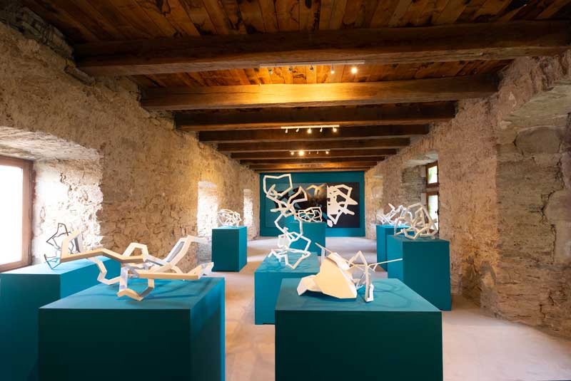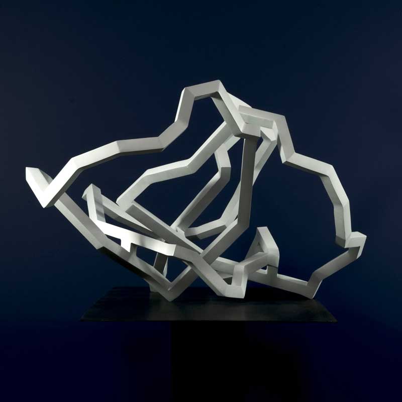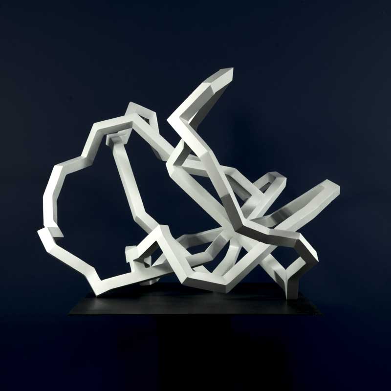 When facing a Sanhes sculpture, any beholder’s contemplating habits will encourage them to walk around it to get a ‘general idea’ of a form-shaped form. But such an approach is far too static and therefore those habits are bound to fail because of the interlacing. The expected or targeted unity is missing. Hardly is the beholder disappointed, when they can turn toward that experience of another type of unity triggered by the necessary movement around the sculpture during which the stream of ‘pictures’, landscapes, lines have emerged to form a visual sequence with a rhythm of their own, their episodes, their tense and relaxed moments. This sculpture is cinematic. These lines ‘write’ a story about the mobility of the interlacing of the lines as they unfold as soon as one walks around them since the beholder’s walk replaces the unwinding of the reels. When walking around a sculpture, one views a series of abstract pictures. The success of the sculpture lies in the quality of this sequence of pictures for which one can use the usual criteria: continuity, breakdown, suspense, surprise, in the strictest abstraction of these white lines. Nicolas Sanhes’s sculptures are abstract movies.