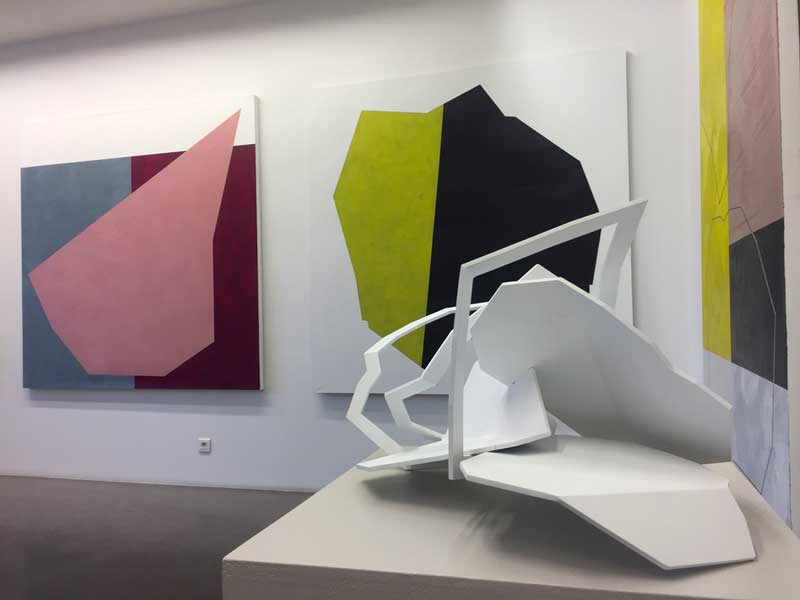 In Nicolas Sanhes’s paintings the content/form difference often shows. The coloured surfaces, all in flat tints, irregular, rather complex geometric shapes that are sometimes reproduced in the painting somehow float in the background. It is as if the background keeps them suspended rather than their being laid on it. In their pretended weightlessness they seem to develop themselves freely, ready to move, to fall down, to connect themselves differently and in the end form new constellations. When facing a painting, apparently as steady as a picture, the gaze that believed it has found an Appollinian shelter, is taken away, knocked over and toppled over in each corner of the painting, summoned in another angle from where, each time, it discovers a new imaginary landscape. The painting shows only flat tints, there is neither volume nor depth (particularly when the colours are not transparent) and yet the gaze, quickly swept along by these Matisse-like objects, starts moving around them in the imaginary depth of the painting as they would move around a sculpture by this painter. The difference with the sculpture remains: the last word is always that of the picture which implies a purely optic perception. That’s the way visual punctuations work, key or nail-shaped; they stand out on the surface of most of Sanhes’s paintings’ surfaces. They are here to restore some steadiness and stability in the dizziness so as to give the last word to the shot, displaying it. Nicolas Sanhes calls them ‘tenseurs’ (tensors) associating them with Chillida’s Combs Of The Wind: in the windswept San Sebastian bay, they ‘promise’ the Basque artist’s fellow countrymen to impose a touch of order to the fury of the winds without preventing them from blowing. Sanhes’s sculptures blow up winds of pictures provided that the beholder accepts being caught in this movement. It is never a fury, it is a rhythm. And when it happens on the surface of the painting, this rhythm turns into a picture and, eventually, the sculpture becomes iconic.