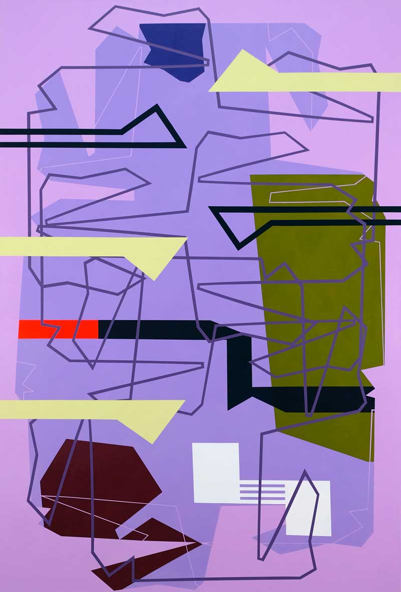 Dans le cas des peintures, la poursuite de la composition est tout aussi complexe. J’ai été frappé en examinant les étapes de préparation informatique des peintures de voir que Sanhes procédait, avec les moyens techniques nouveaux dont disposent maintenant les artistes, de la même manière que la grande peintre américaine Shirley Jaffe, dont j’eus l’honneur d’être l’ami et le critique. Celle-ci, à la différence de Sanhes, ne partait pas d’une structure géométrique mais d’une première esquisse à la gouache plutôt expressionniste. Progressivement elle resserrait et durcissait les formes et surtout les déplaçait en tentant des séries de mises en place qui prenaient fin quand elle estimait avoir atteint la composition juste. A l’époque, il y avait à peine des ordinateurs et Shirley Jaffe utilisait souvent des cellophanes et des calques pour ajouter et déplacer les formes mais elle était à la recherche de la composition juste qui mettait fin au processus. Sanhes procède de manière analogue mais les essais se font sur l’écran et ils se poursuivent lors de la réalisation manuelle, quand il fait jouer des lignes qui semblent passer dessus et dessous les formes pour perturber la relation fond-forme. De même encore, les couleurs sont passées soigneusement en suivant les délimitations des masking tapes, mais soudain un passage brusque et moins soigné vient perturber la perception, ou l’ajout de formes qui équilibrent ou, au contraire, déséquilibrent l’ensemble.