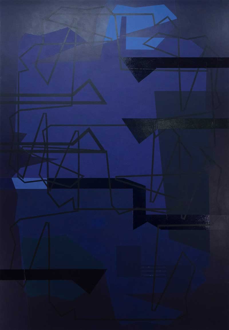 L’œuvre est construite de lignes brisées. Pas de courbes – elles seraient manque de tension, faiblesse de ce qui ne se tient pas, abandon ou relâchement. Le nombre et la diversité des angles, la pluralité des lignes qui s’entrecroisent, se rapprochent ou s’éloignent, plus longues ou plus courtes créée l’unité multiple d’une très vive tension. Toutes les lignes ont la même épaisseur, ni les ombres apparaissantes, ni les perspectives n’altèrent leur affirmation : aucun affaiblissement ici. Chacune d’elle est refermée sur elle-même, sans prolongement possible, sans l’indétermination qui apparaîtrait de la possibilité de les prolonger. Aucune continuation non maîtrisée, comme si une suite, ou manque, était en attente. L’œuvre se lie à elle-même, ensemble refermé sur lui. Cette clôture est la condition de son ouverture interne. De cette liaison à soi surgit sa force. Celle-ci est paradoxalement produite par l’organisation close des entrelacements, du rapprochement et de l’éloignement interne des lignes entre elles. Elles se rejoignent, elles se croisent ou s’éloignent l’une de l’autre. En ses orientations multiples, aucune verticalité ou horizontalité strictes. Pas d’angle droit, tout est en elle oblique. Ses lignes sont lignes brisées, faites cependant des inflexions successives d’une même continuité : aucune cependant qui n’enveloppe plusieurs orientations, plusieurs élans. D’où la proximité des angles entrants et sortants. Toutes les tensions de l’œuvre résultent de ces montées, stabilités ou descentes.