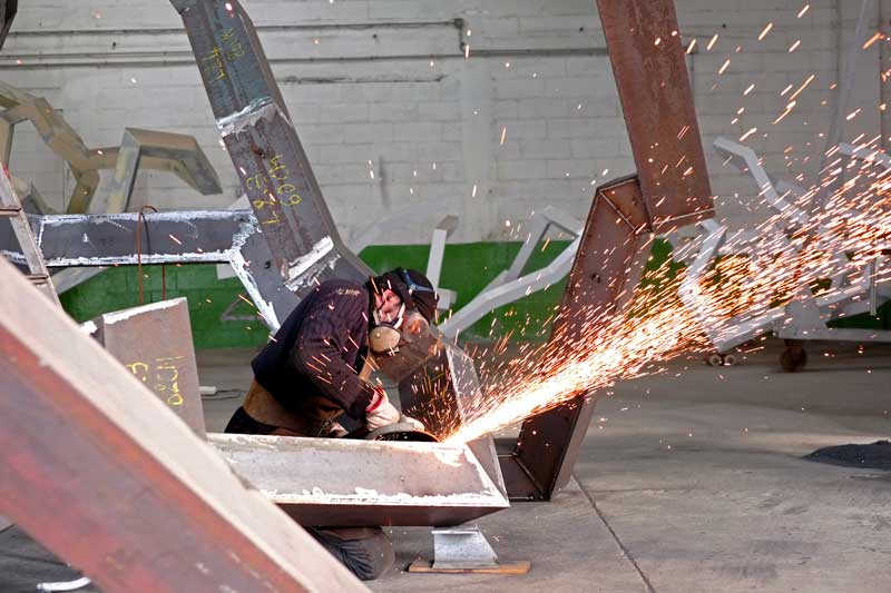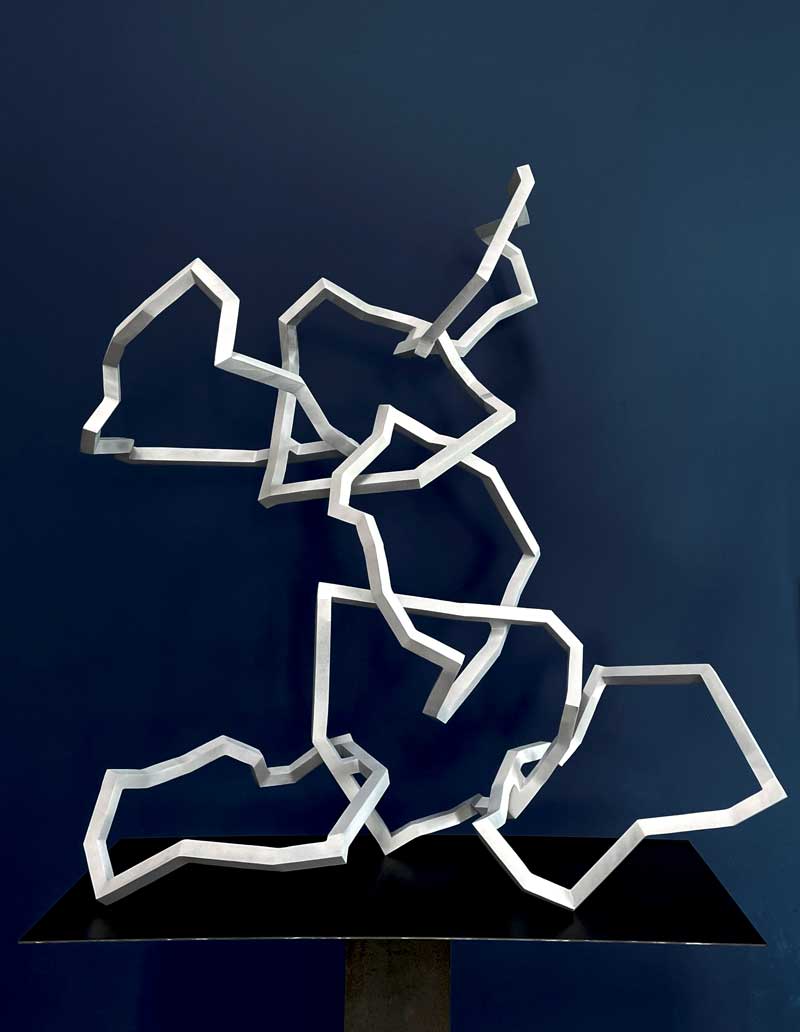 Ses sculptures d’acier, quelles que soient leurs tailles, fonctionnent toujours en circuit fermé. Toujours posées sur trois arêtes, elles évoquent l’image d’un équilibriste, explorant des déséquilibres jusqu’à atteindre une cohésion dans le labyrinthe qu’elles façonnent. Le vide entre ses lignes devient alors un espace de dialogue, une matière immatérielle où la densité de l’air défie l’apesanteur de l’acier.