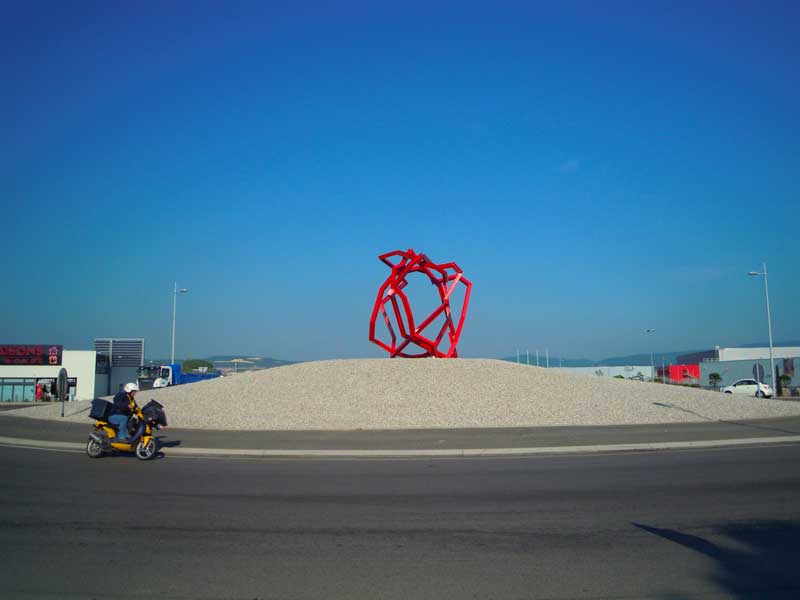 Dans des conditions aussi difficiles et même impossibles, j’admire depuis longtemps le talent et la subtilité de Nicolas Sanhès. Ses « résilles » de cornières métalliques, aux dimensions imposantes mais jamais hors de propos, polarisent les espaces (places, jardins, ronds-points) sans peser. Leur forme ouverte est elle-même matrice d’innombrables sous-formes qui apparaissent au fil des déplacements aussi bien du regard que du corps des passants et spectateurs. Ces sculptures en forme de nids, de vasques, de reliefs géologiques donnent sens à des espaces urbains qui sont devenus aujourd’hui la plupart du temps des espaces poubelles (junk spaces selon l’expression de Rem Koolhaas) ou des non-lieux où l’on passe sans pouvoir se situer et sans savoir où l’on est. Elles ont aussi l’avantage fonctionnel de ne pas couper la vue, de ne pas produire de zones aveugles, ce qui est important aussi bien pour la circulation que pour la sécurité. Elles établissent ce que j’appellerais un « commerce avec l’espace », c’est-à-dire une relation heureuse, sereine et calme, équilibrée et forte, sans s’imposer ni comme choc visuel imposant l’attention, ni comme signe porteur de message ni comme installation se dissolvant de manière gazeuse dans l’espace. La recherche est celle d’un équilibre précis et juste. Nicolas Sanhes le dit mieux que je ne le ferais : « dans la sculpture si j’écarte trop les lignes, la sculpture se creuse. Inversement si je les resserre trop, elle se referme et son énergie s’affaiblit. C’est cette dualité qui est importante à trouver, cette mise en tension qui fait que l’œuvre trouve sa pleine puissance. » Il y a là un traitement de l’espace rare et précieux, qui ramène aux fondamentaux de la sculpture dans un espace neutre. Si j’ai mentionné Bernar Venet, c’est parce que celui-ci a une recherche analogue, plus tournée vers le sublime et les effets grandiloquents, mais toujours avec des formes ouvertes. A l’opposé, il faut bien reconnaître que beaucoup de « sculpteurs » aujourd’hui font l’impasse sur cette problématique et produisent de « l’art de ronds-points », dont l’incongruité contribue encore un peu plus au devenir-poubelle de l’espace public.