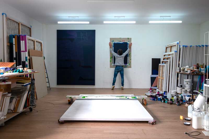 Dans un coin de l’atelier où Nicolas Sanhes réalise ses peintures, on peut remarquer une boule de morceaux de bandes d’adhésif maculés de couleurs, collés les uns sur les autres et qui forment une sorte d’œuf de papier avec des vides et des pleins. Ce sont des restes de masking tapes, ces rubans de masquage qu’utilisent les peintres professionnels pour passer les couleurs sans déborder sur les parties qui ne doivent pas être peintes ou le sont d’une autre couleur – plinthes, rebords de fenêtres, vitres, angles. Les artistes qui veulent délimiter avec précision formes et fonds utilisent aussi ces bandes de masking tapes. Mondrian fut un des premiers à s’en servir avec quelque chose comme du sparadrap ; de même ensuite Newman. Nicolas Sanhes s’en sert pour bien délimiter les découpes des formes géométriques sur ses surfaces.