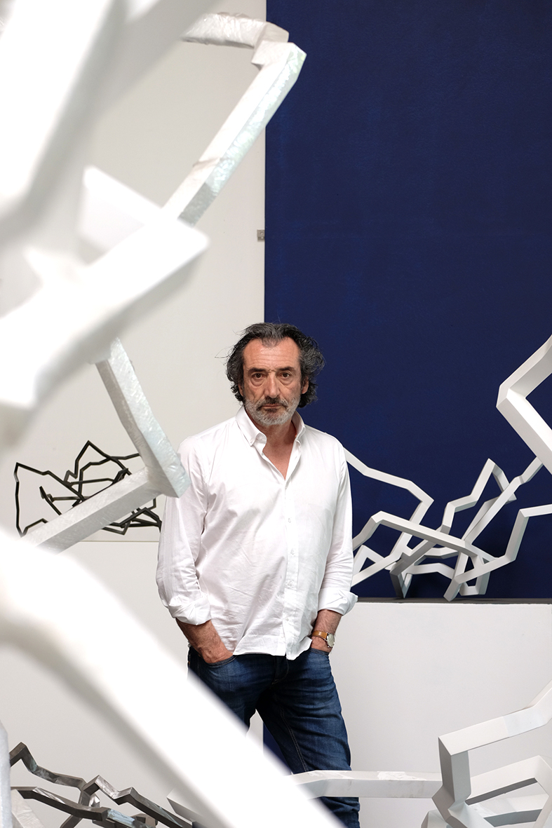 Avant d’entrer dans le vif du sujet, à savoir : la peinture du sculpteur, il convient de revenir brièvement sur son œuvre sculpturale. Depuis près de trois décennies, Nicolas Sanhes est reconnu pour ses grandes sculptures blanches. Ses œuvres monumentales s’inscrivent dans une filiation qui rappelle les figures emblématiques de la sculpture contemporaine, telles que Bernar Venet, Robert Schad, et, plus proche de nous, notre compatriote basque Eduardo Chillida. Pourtant, son approche artistique se distingue nettement de celle de ces maîtres. Là où Venet, Schad et Chillida explorent la ligne comme un élément de structure et de mouvement, Sanhes adopte une démarche unique : il referme la ligne, transformant ainsi cette dernière en une forme qui accueille un vide. Cette spécificité confère à son œuvre une dimension inédite où le vide n’est pas simplement une absence, mais un espace de potentialité. Dans ses sculptures, chaque courbe et chaque angle semblent dialoguer avec le néant, créant une tension palpable entre la matière et l’immatériel. Ce choix délibéré de refermer la ligne permet à Sanhes de jouer avec les perceptions, invitant le spectateur à contempler non seulement la forme, mais aussi ce qu’elle suggère au-delà d’elle-même.