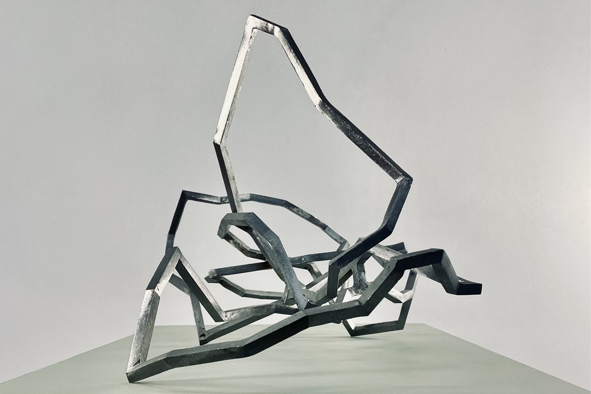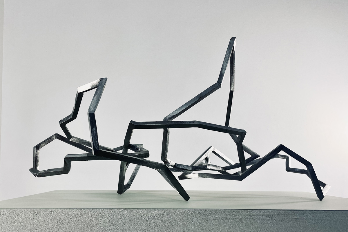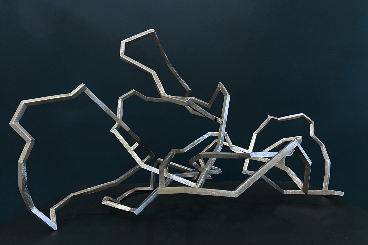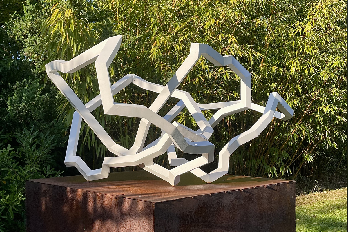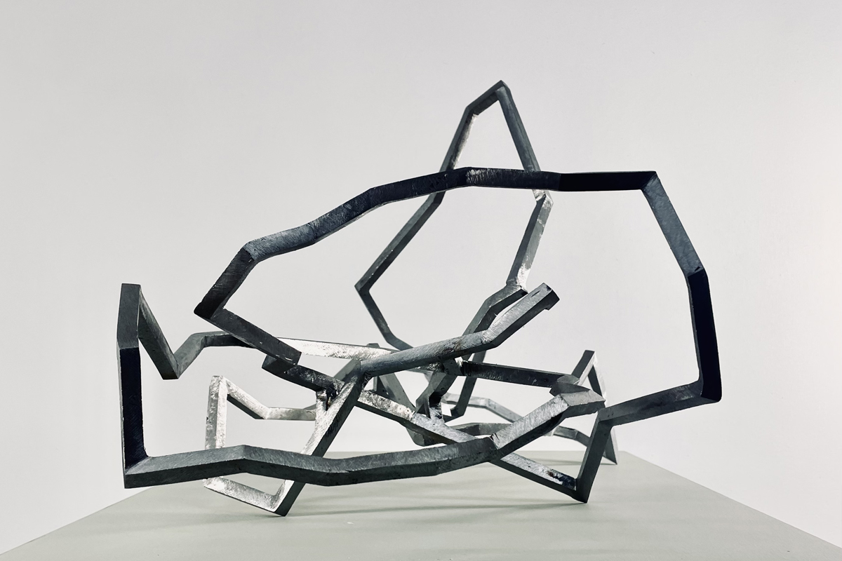 Mes petites sculptures interrogent la légèreté radicale de l’acier — ces lignes de 5, 10 millimètres d’épaisseur, presque immatérielles, qui défient la densité habituelle de la matière. Ici, l’acier n’est plus masse, mais trace aérienne, une écriture spatiale où chaque ligne ou segment semble suspendre le temps. Réaliser une œuvre à cette échelle exige une autre approche de l’objet : il s’agit de conceptualiser l’espace différemment, non plus en termes de volume à occuper, mais de présence à habiter. La monumentalité ne réside pas dans la dimension, mais dans la capacité de l’œuvre à transformer l’espace qui l’accueille, à en révéler les tensions ou les silences.