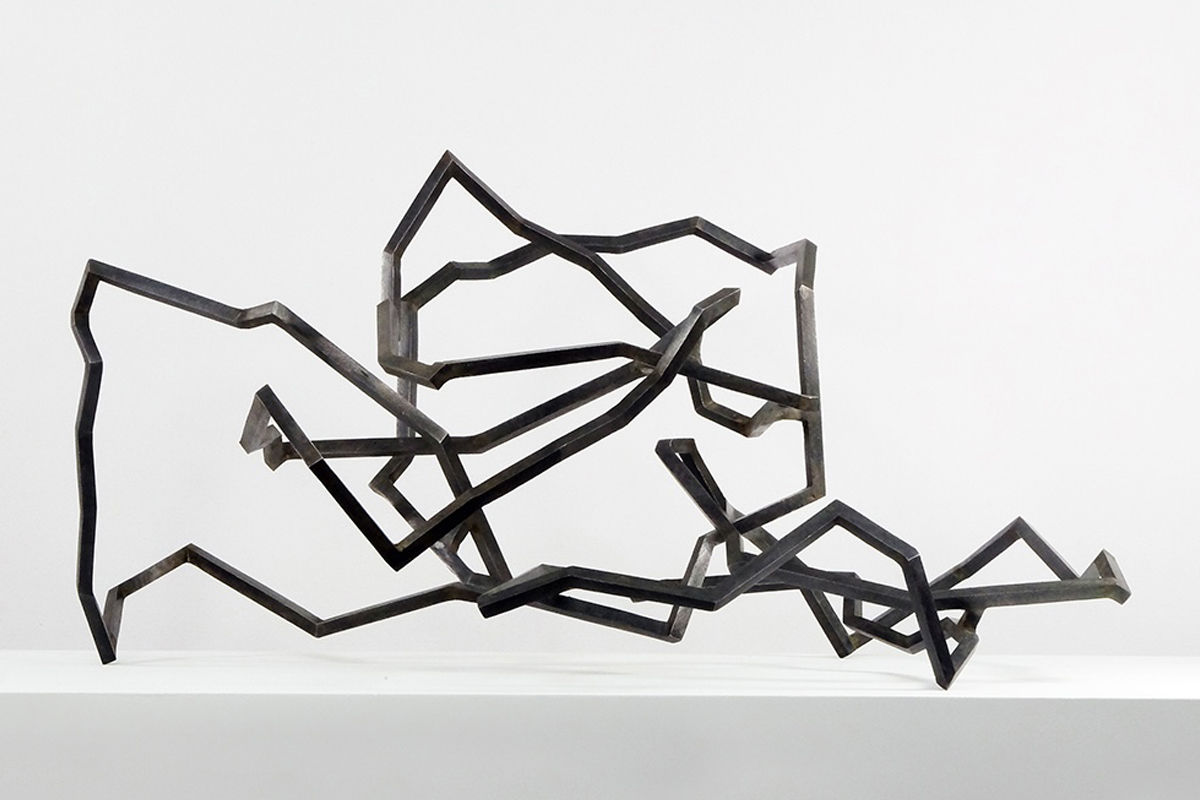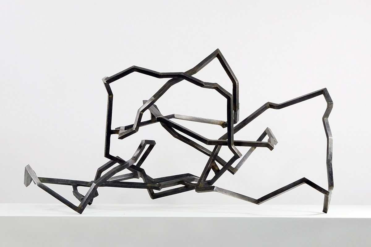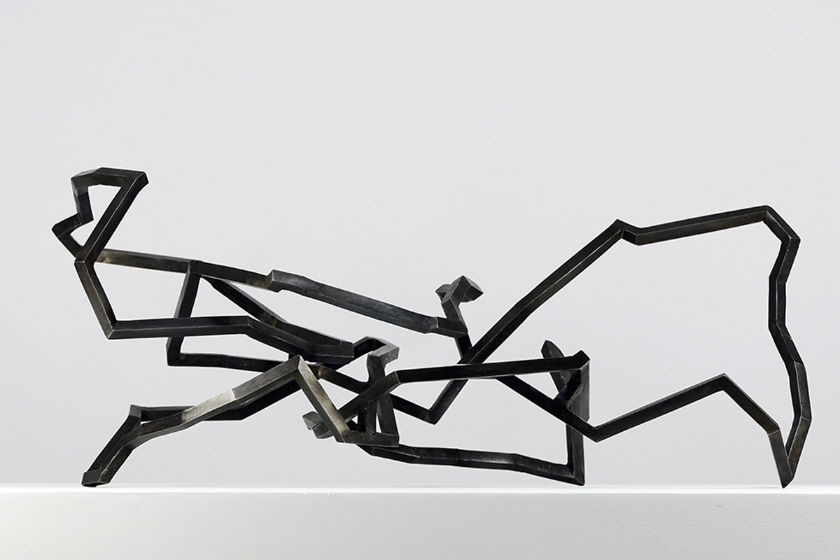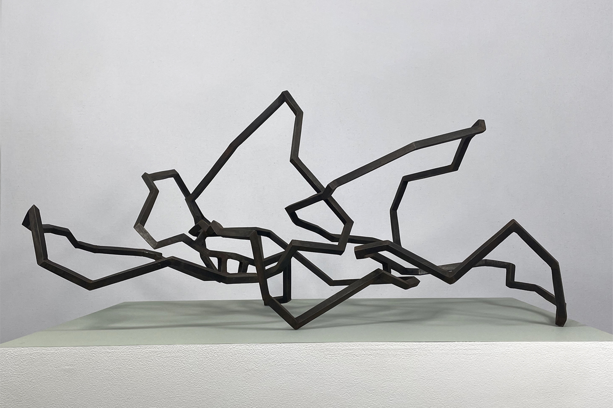 Mes petites sculptures interrogent la légèreté radicale de l’acier — ces lignes de 5, 10 millimètres d’épaisseur, presque immatérielles, qui défient la densité habituelle de la matière. Ici, l’acier n’est plus masse, mais trace aérienne, une écriture spatiale où chaque ligne ou segment semble suspendre le temps. Réaliser une œuvre à cette échelle exige une autre approche de l’objet : il s’agit de conceptualiser l’espace différemment, non plus en termes de volume à occuper, mais de présence à habiter. La monumentalité ne réside pas dans la dimension, mais dans la capacité de l’œuvre à transformer l’espace qui l’accueille, à en révéler les tensions ou les silences.