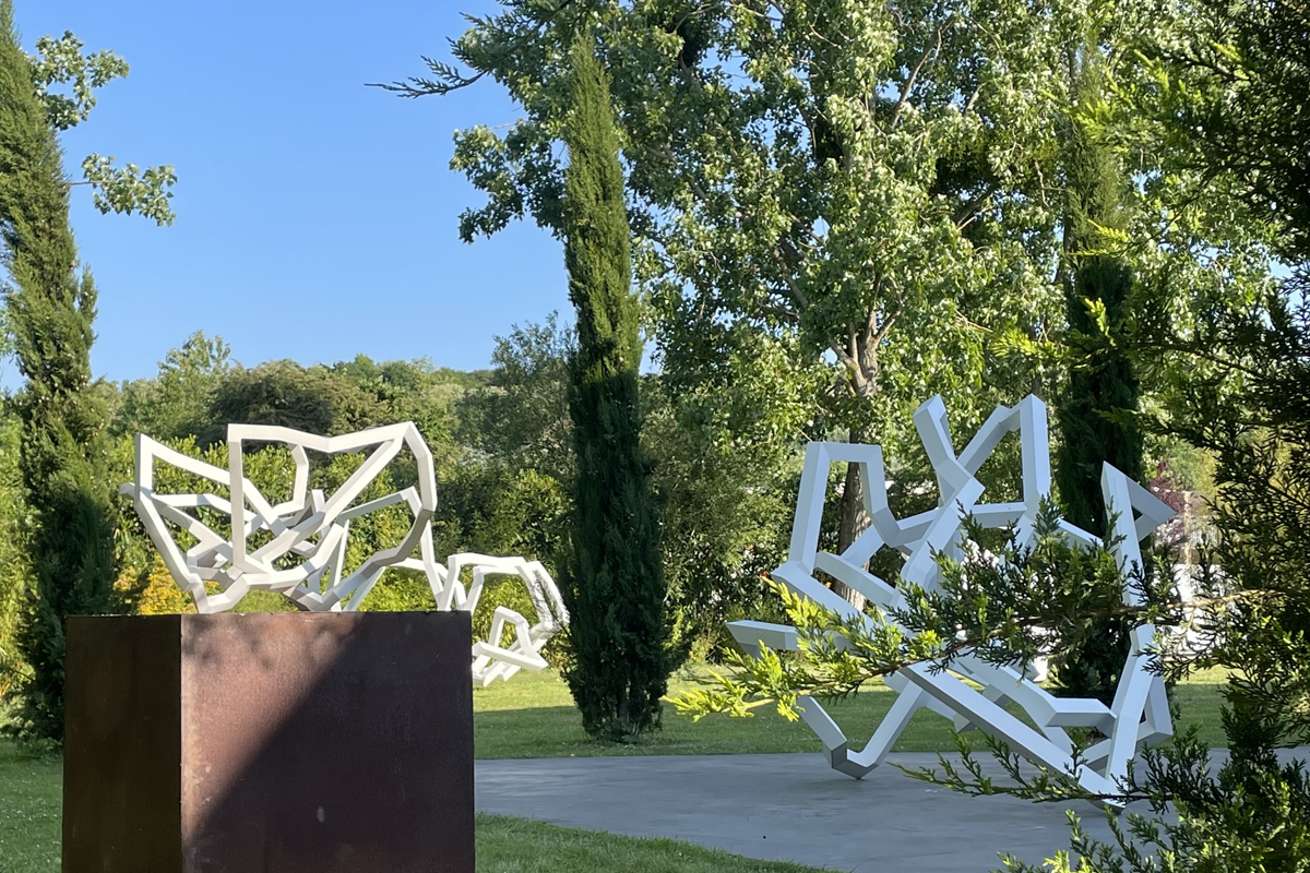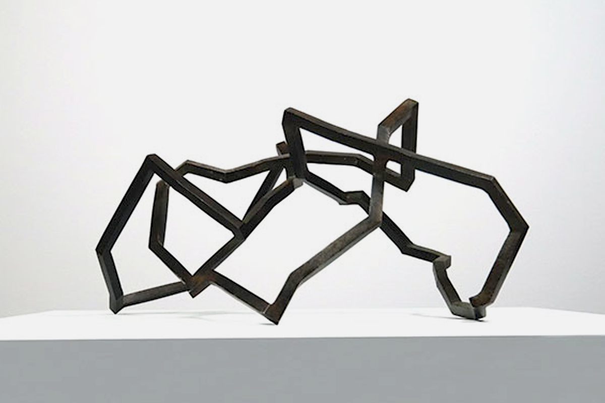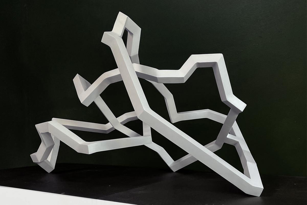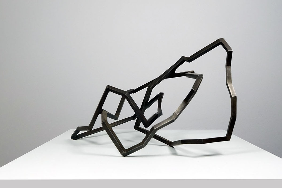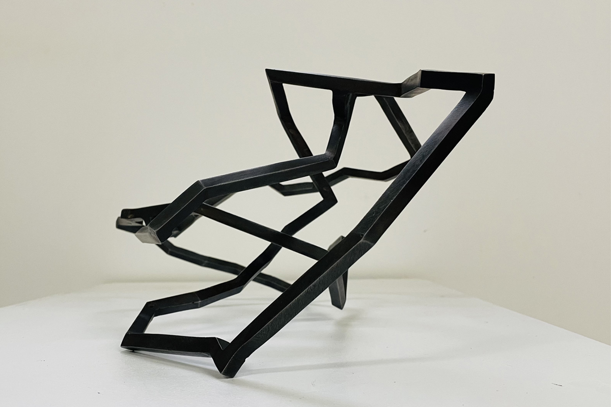 Mes petites sculptures interrogent la légèreté radicale de l’acier — ces lignes de 5, 10 millimètres d’épaisseur, presque immatérielles, qui défient la densité habituelle de la matière. Ici, l’acier n’est plus masse, mais trace aérienne, une écriture spatiale où chaque ligne ou segment semble suspendre le temps. Réaliser une œuvre à cette échelle exige une autre approche de l’objet : il s’agit de conceptualiser l’espace différemment, non plus en termes de volume à occuper, mais de présence à habiter. La monumentalité ne réside pas dans la dimension, mais dans la capacité de l’œuvre à transformer l’espace qui l’accueille, à en révéler les tensions ou les silences.